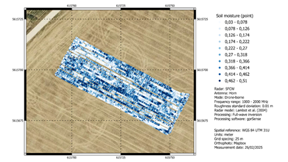 By equipping the drone with an L-band Ground Penetrating Radar (GPR), we can capture the dielectric properties of the soil—essentially measuring how much water is held in the upper layers—without ever touching the ground.