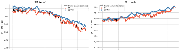 To validate these surrogate models, I use reference simulators based on exact numerical solutions of Maxwell’s equations — primarily solvers based on FDTD (Finite-Difference Time-Domain) and FDFD (Finite-Difference Frequency-Domain) methods. These tools, such as gprMax, numerically solve the full electromagnetic problem on a fine 3D grid, capturing all wave phenomena including reflections, diffractions, and scattering, without any of the simplifying assumptions made by the surrogate models. Simulations are run at GPS L1 frequency (1.575 GHz) with multiple receiver positions covering a range of incidence angles, allowing a systematic comparison between the full-wave reference and the SPA surrogate.